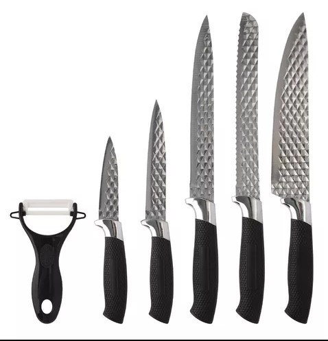 Conteúdo: 01 Faca de Cheff 01 Faca de Pão 01 Faca de Cozinha 01 Faca de Cozinha 01 Faca de Legumes 01 Descascador