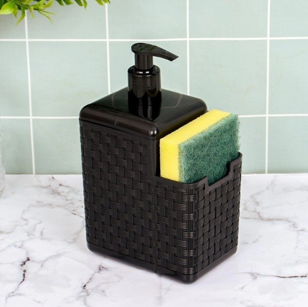 Pote porta detergente possui dispenser.